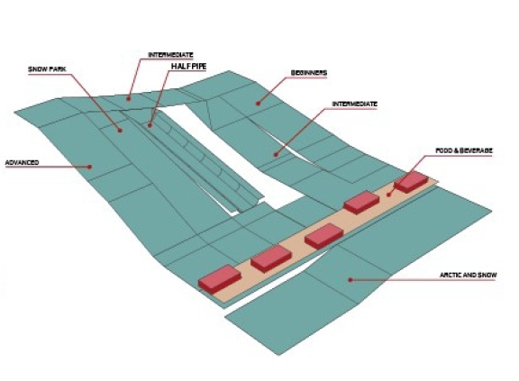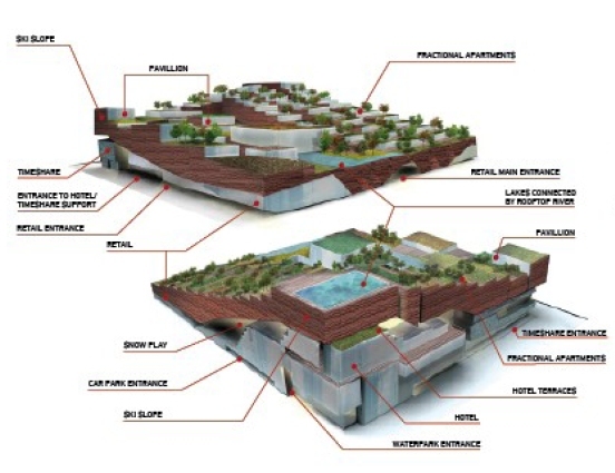 In cooperation with its clients, S333 Architects, Giebros and other partners mixed use projects or resorts are being developed that may consist of The Alps, Arctic World, retail, food & beverage facilities, hotels, apartments, fractionals, indoor water park, SPA, wellness, health & fitness, and additional amusement, attractions and entertainment, parking and more. |