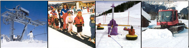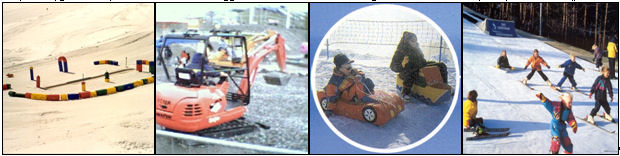 • Slope grooming and snow milling machines • Safety protection and demarcation • Event, race timing and self-timing equipment • Ski school equipment, playground systems and fun hardware • Artificial sliding surfaces and rain covers for dry slopes |